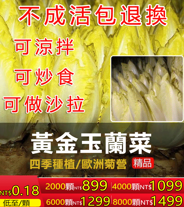 4分鐘前清脆可口的【黃金玉蘭菜】居然這麼簡單就可以種出來!生吃脆香甜,炒肉比肉鮮,輕輕鬆鬆幾個月就可以收穫,關鍵是年年可以割,年年可以長,年年有的吃 - 僅此一天!比利時「金玉蘭種子」8000顆(送狀根肥料)100%用戶的選擇!NT$1499